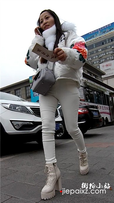 街拍长腿紧身白裤粉色毛毛鞋美眉