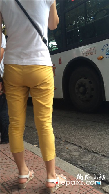 公交站等车的紧身裤眼镜熟女