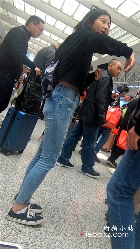 超级紧身蓝色牛仔裤美眉候车室等车