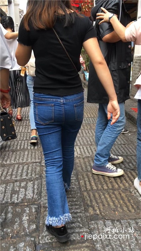 街拍肥美丰臀紧身蓝牛黑T恤少妇