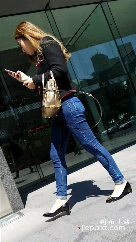 4K - 紧身蓝色牛仔裤黑色外套气质街拍美女