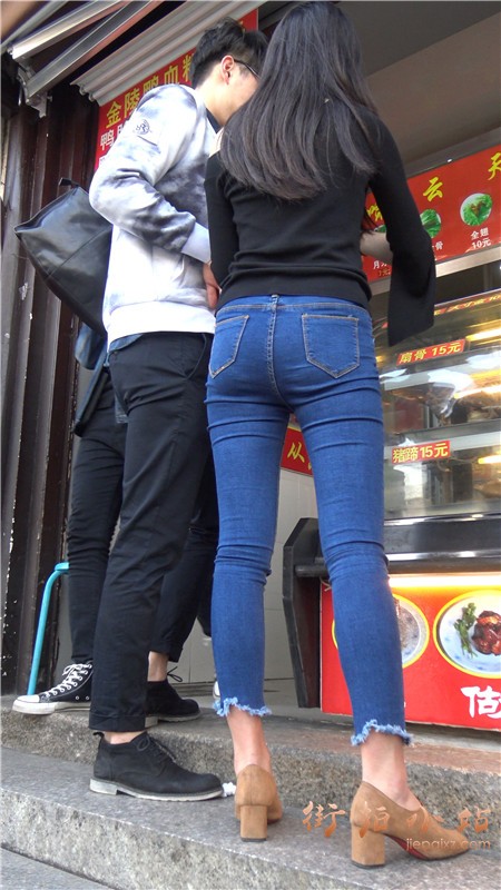 4k-街拍极品身材紧身蓝牛黑T恤好身材女神