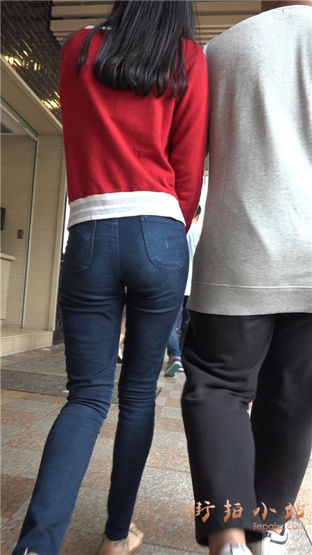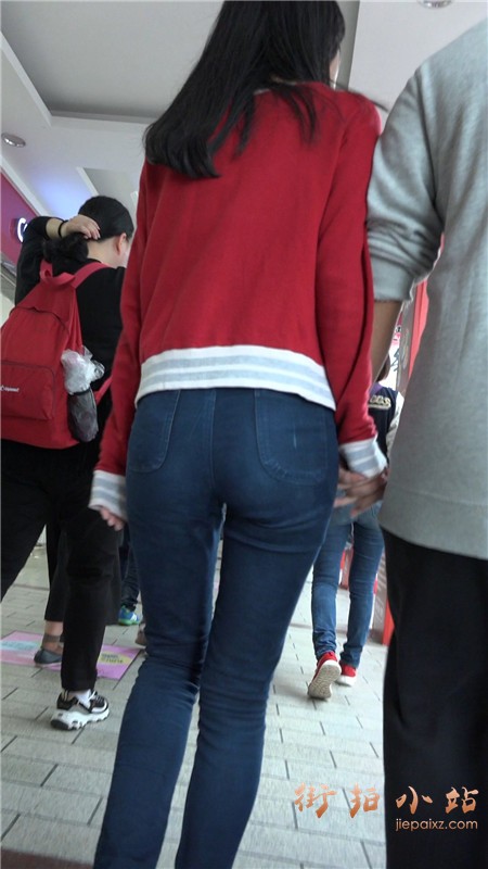 苗条身材街拍紧身牛仔裤红衣小姐姐