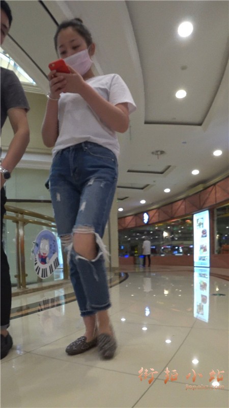 4k-粉色口罩破洞蓝牛小清新街拍美女