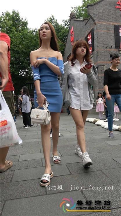 4K-街拍蓝色紧身连衣抹胸包臀裙性感长腿长发美女[MP4/1.46G]