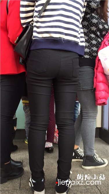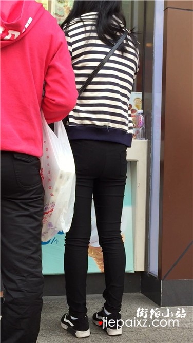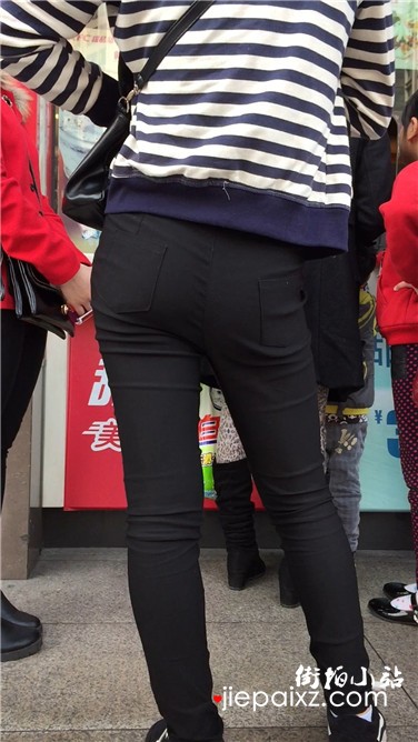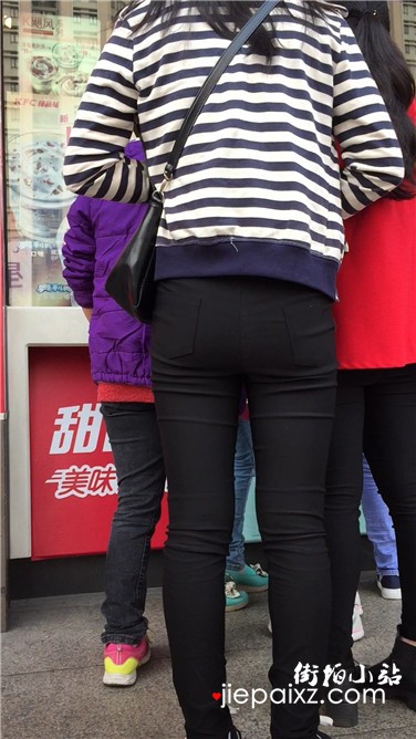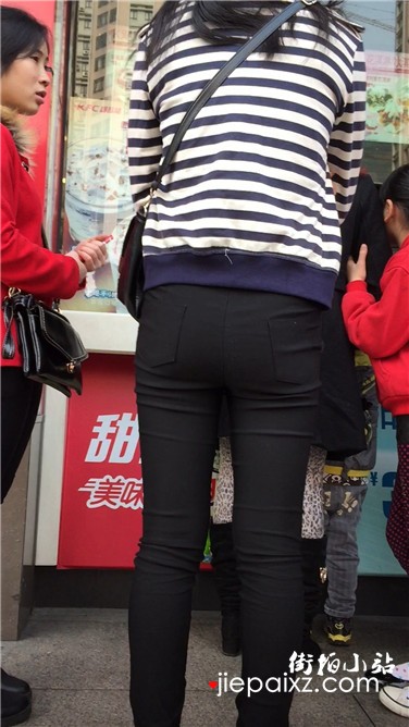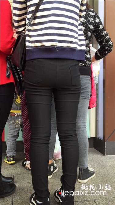 街拍紧身黑裤饱满臀部美少妇排队买甜品