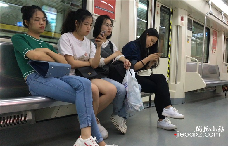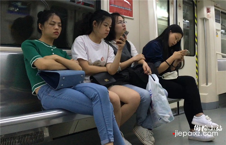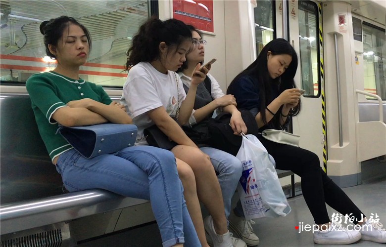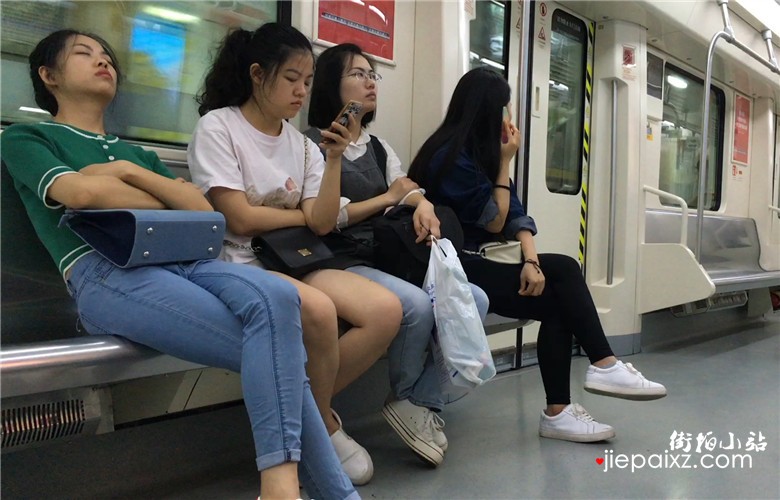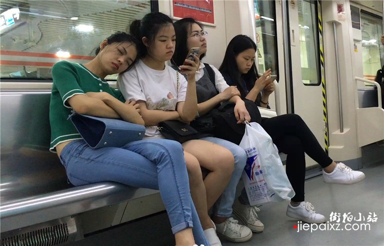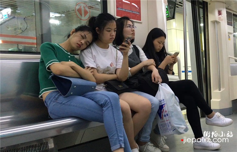 绿色T恤妹子地铁上靠着闺蜜肩膀睡着了