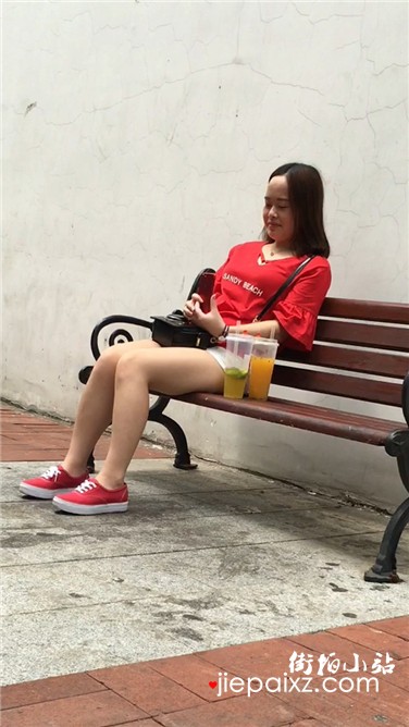街拍粉粉妹子凳子上休息等闺蜜