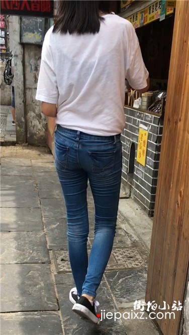 街拍紧身蓝色牛仔裤青春美眉