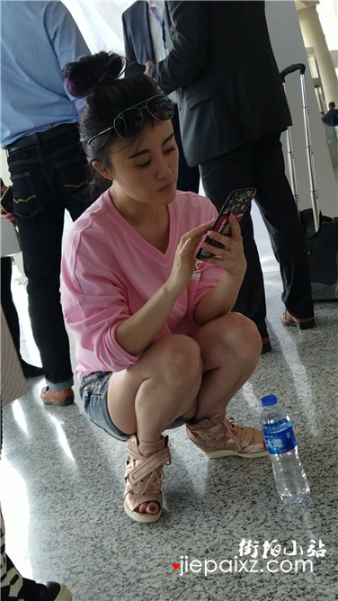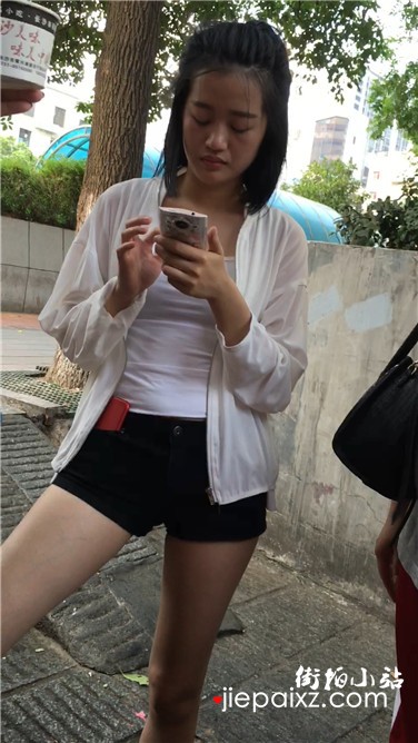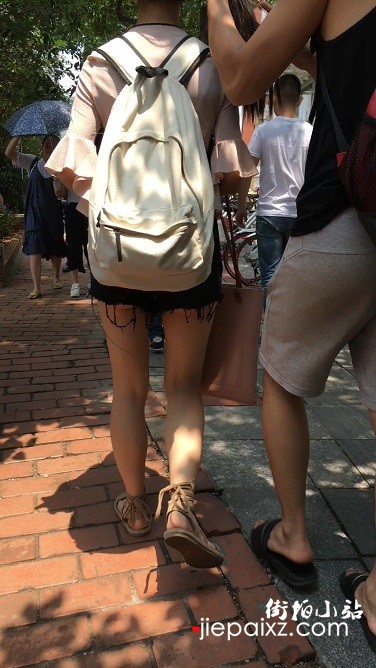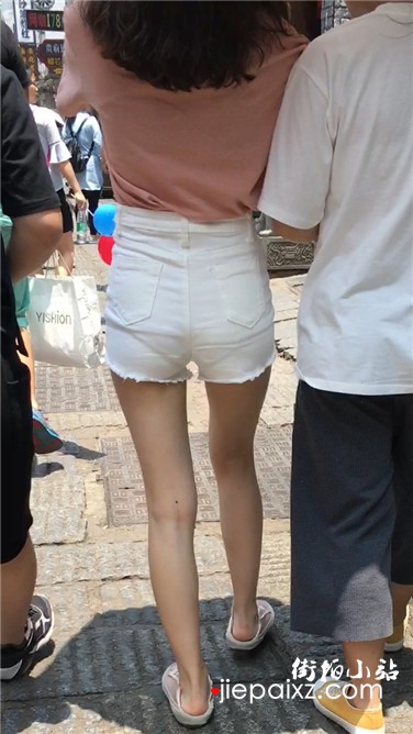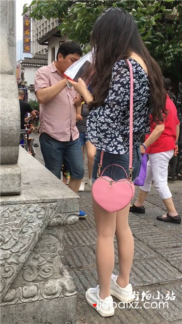 街拍高腰热裤粉衣小清新美眉