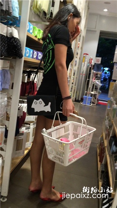 街拍逛超市的黑色修身包臀裙美眉