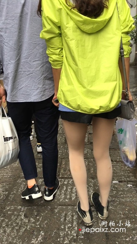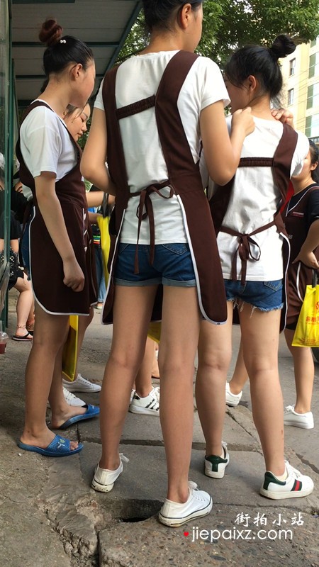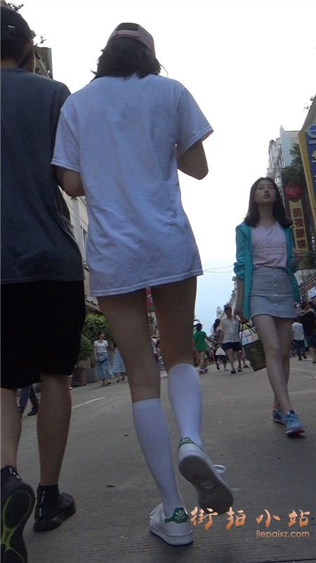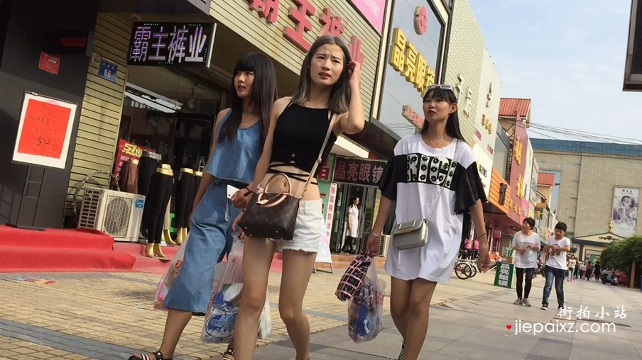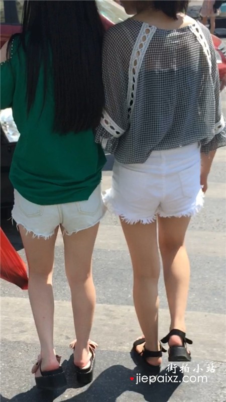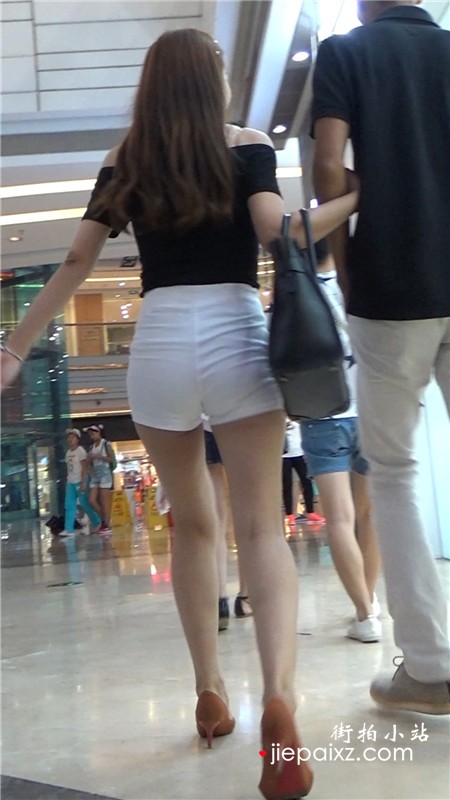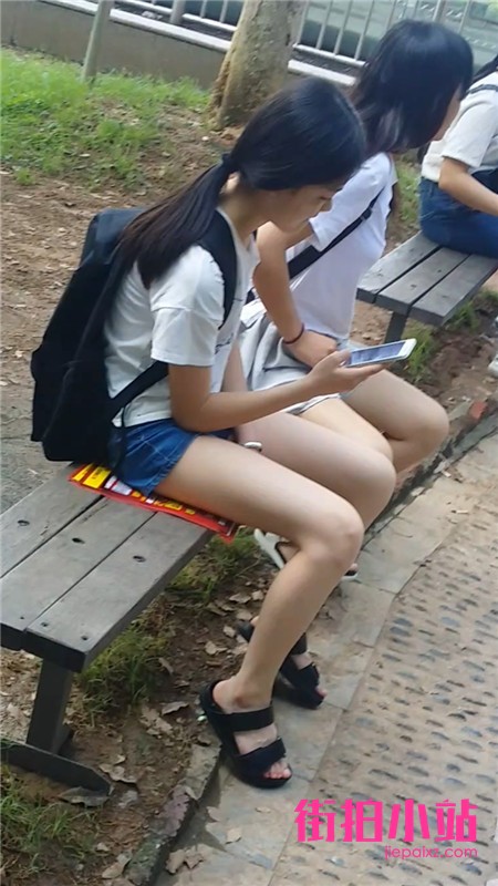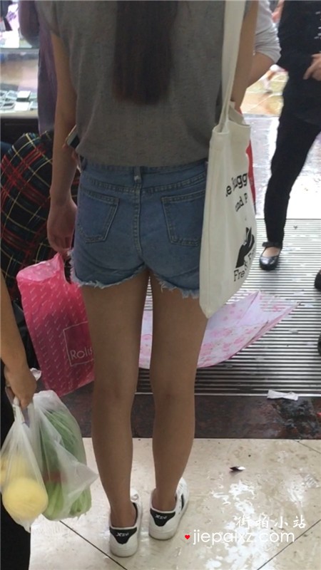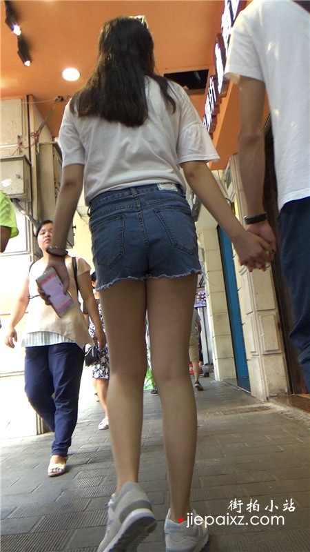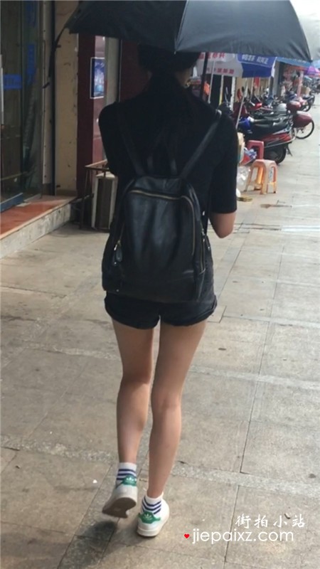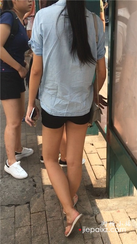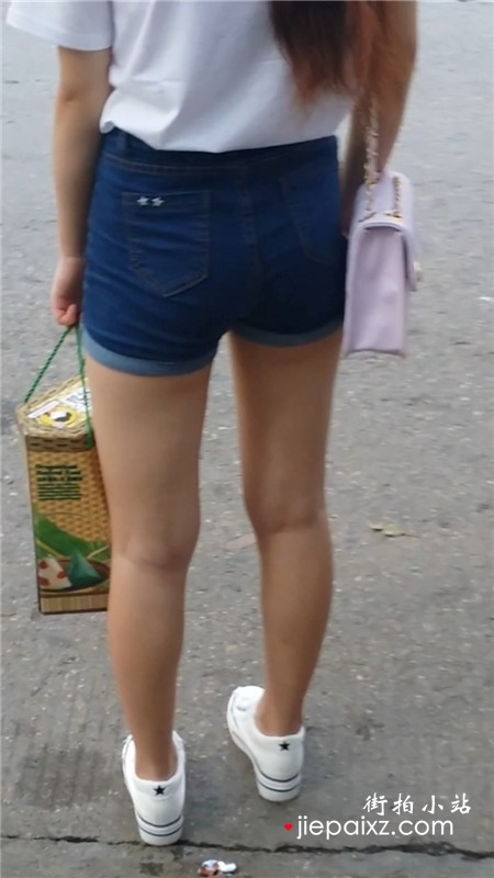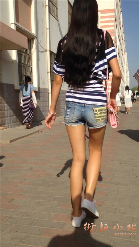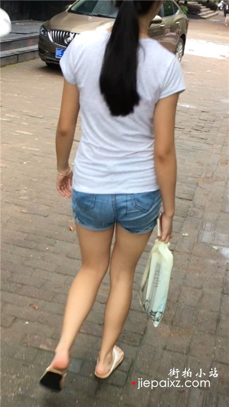 跟拍马尾辫黑色背包牛仔热裤美眉