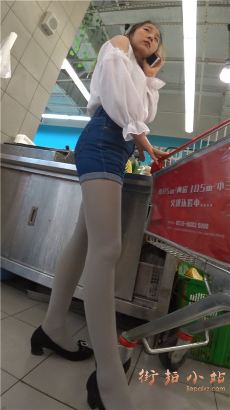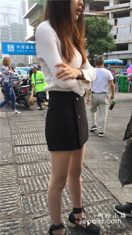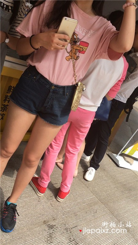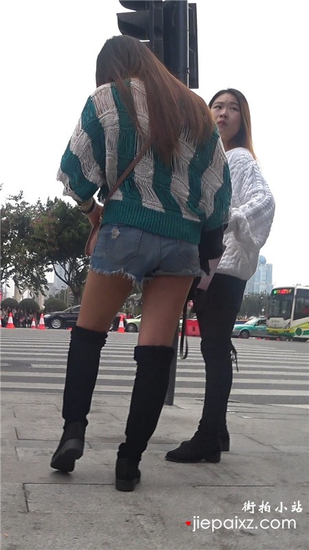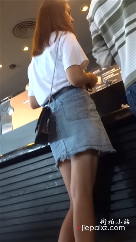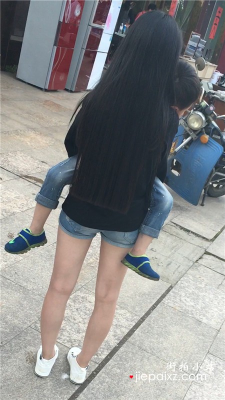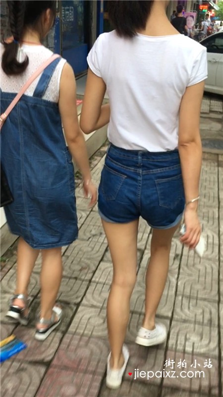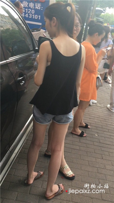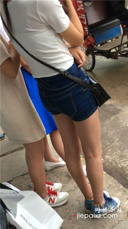 街拍牛仔紧身热裤圆臀黑T恤小姐姐