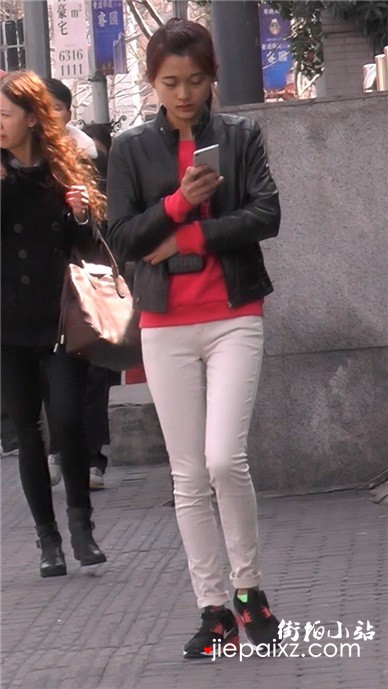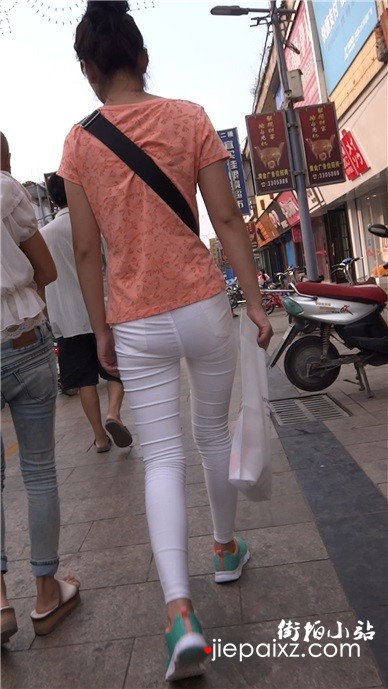 街拍紧身白裤买条娇小美眉