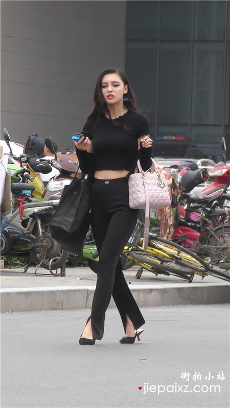 街拍黑色紧身裤小蛮腰气质美女