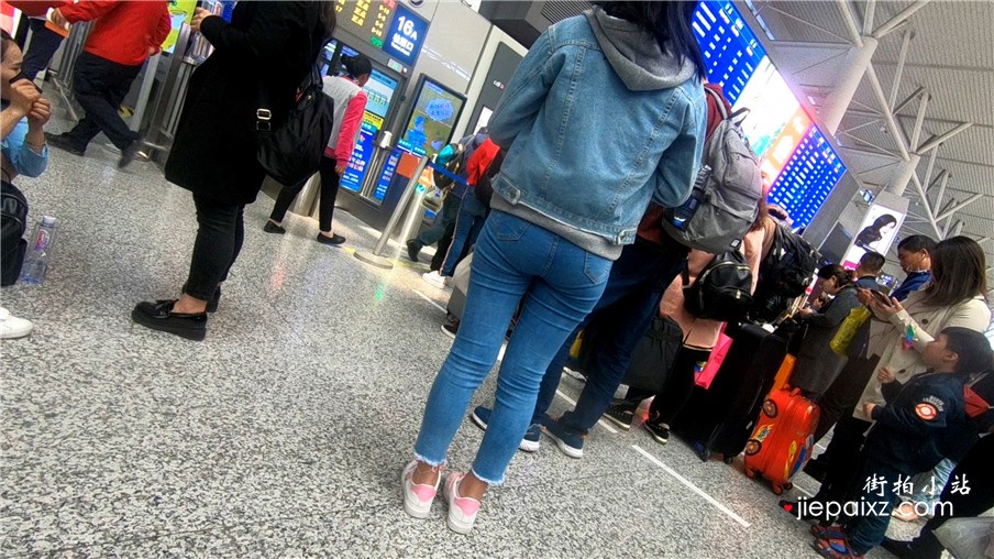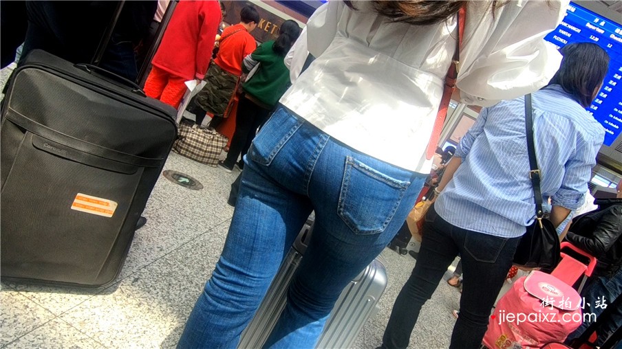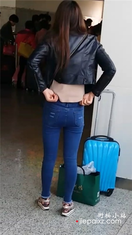 超级紧身蓝色牛仔裤美眉候车室等车