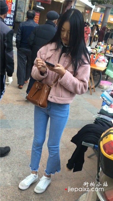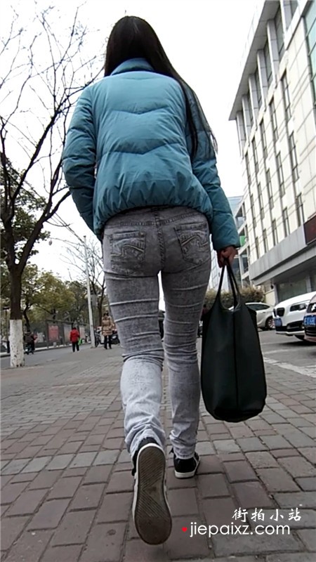 跟拍紧身牛仔裤羽绒服美眉