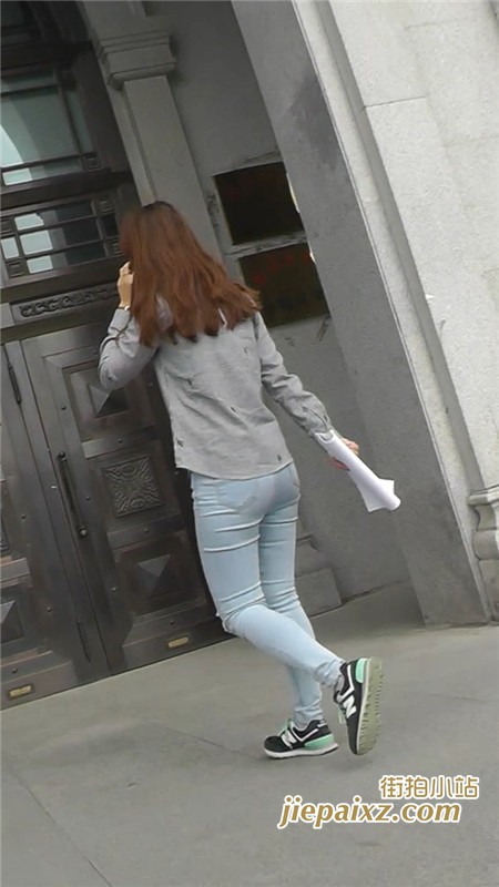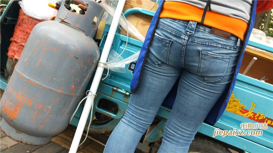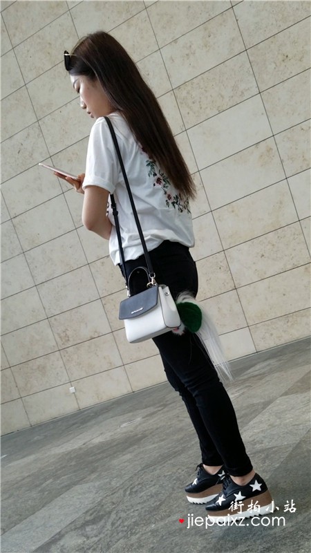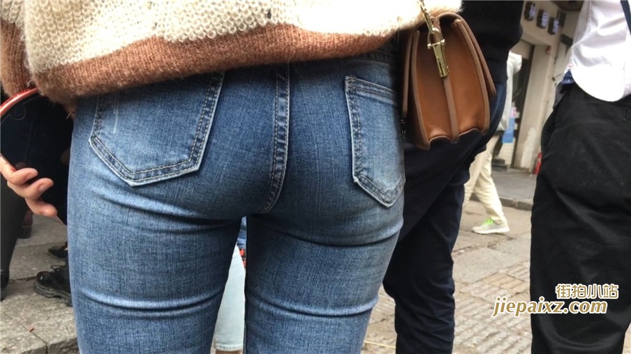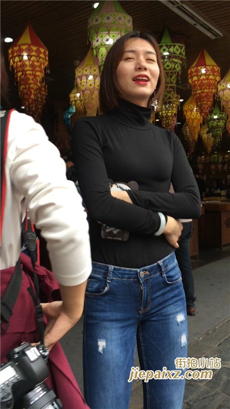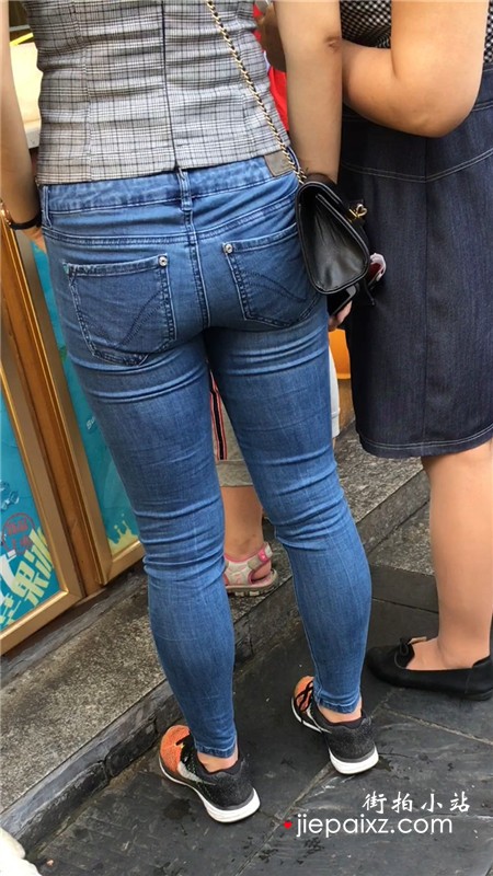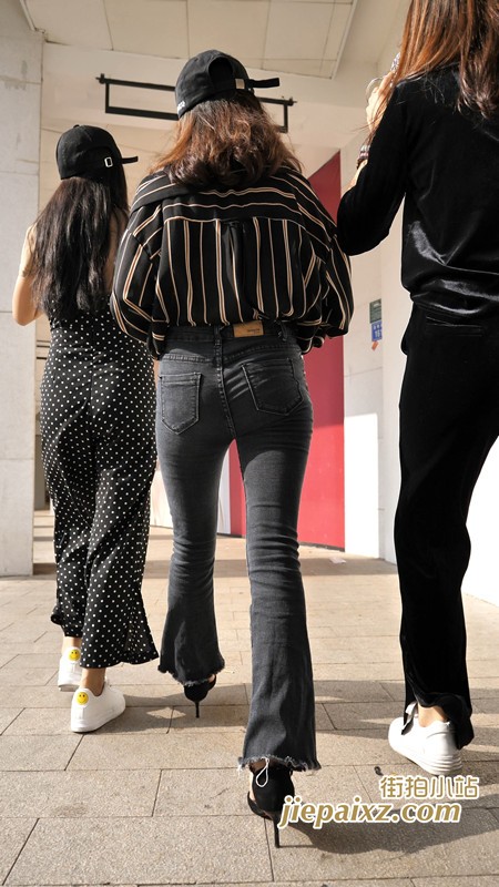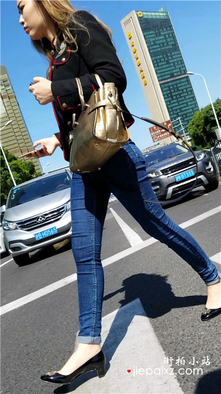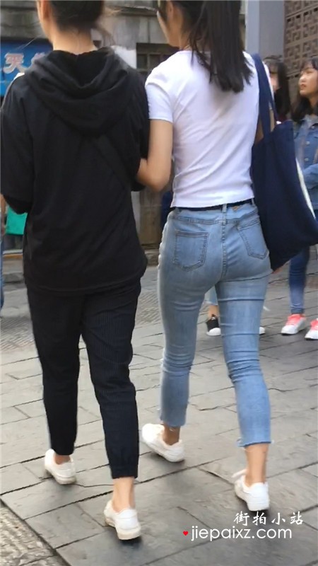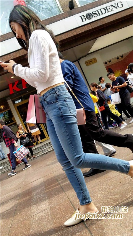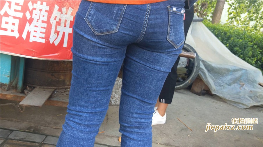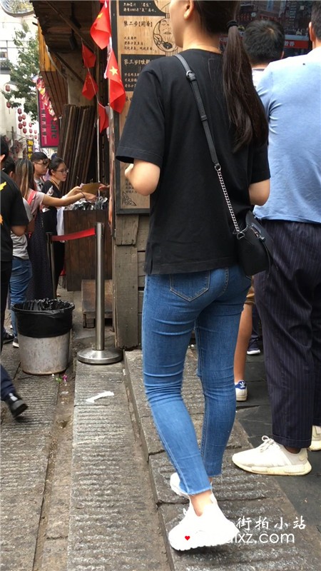 街拍紧身蓝牛黄T恤鸭舌帽小姐姐