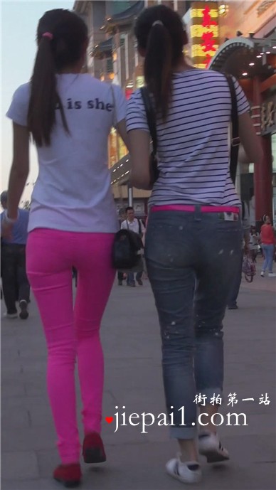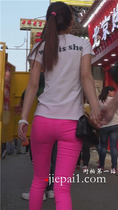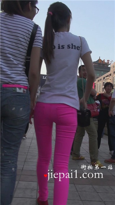 街拍跟闺蜜逛街的粉色紧身裤美女