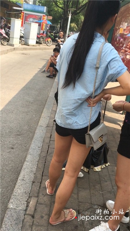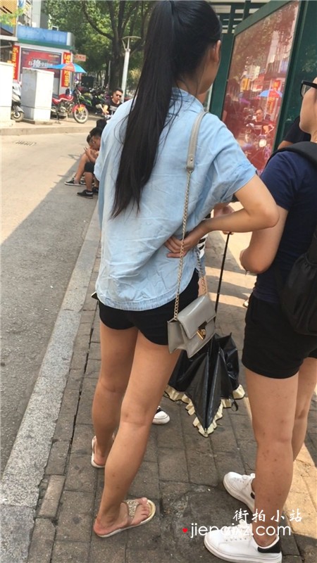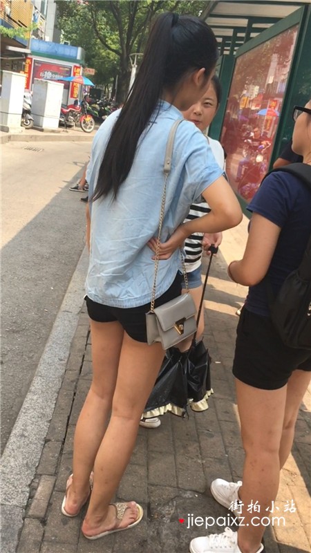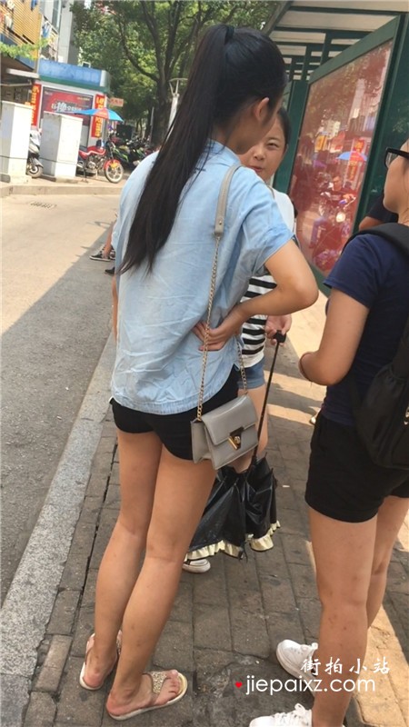 街拍等公交车的热裤马尾辫女孩