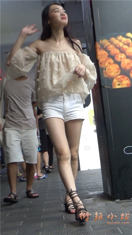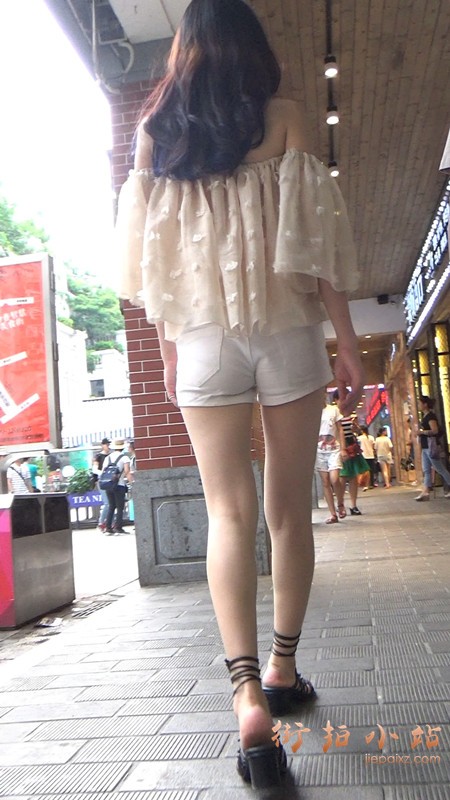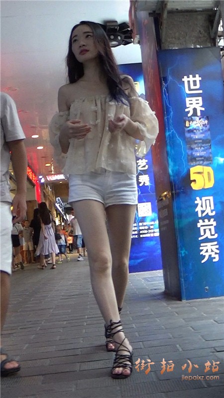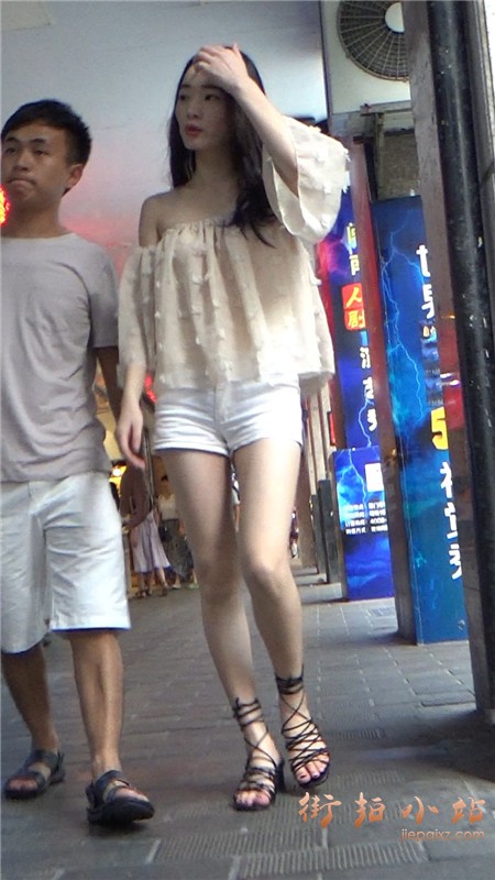 街拍白色短裤一字肩雪纺衫美女姐姐