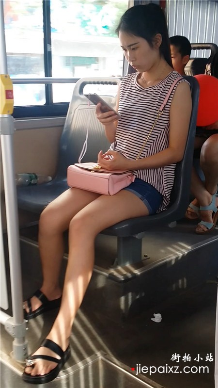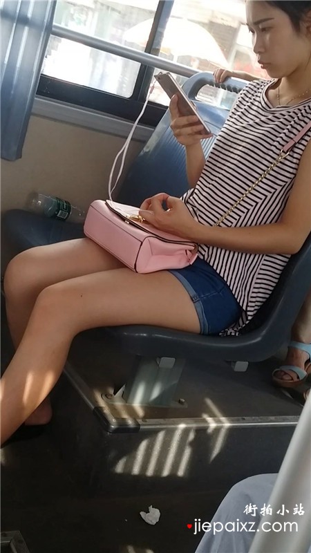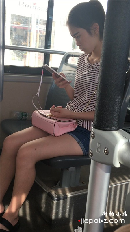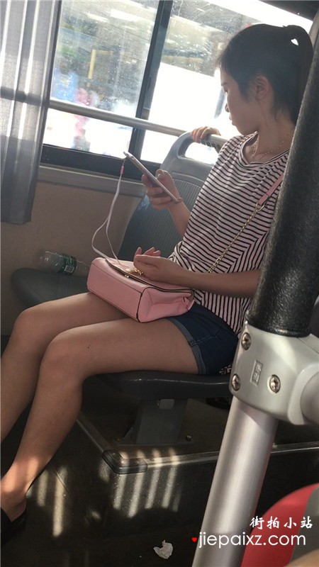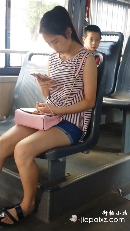 公交车上拍摄条纹T恤衫热裤裸腿MM