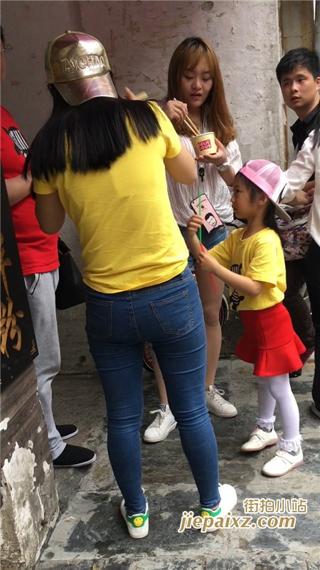 街拍紧身蓝牛黄T恤鸭舌帽小姐姐