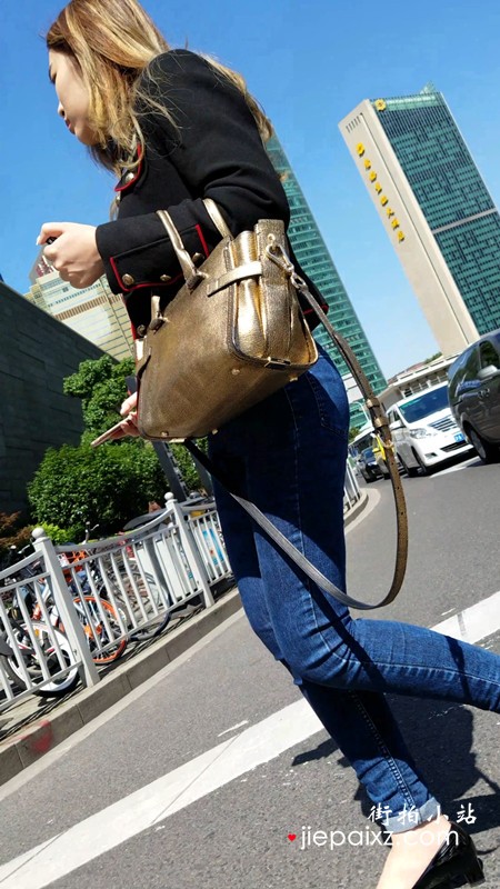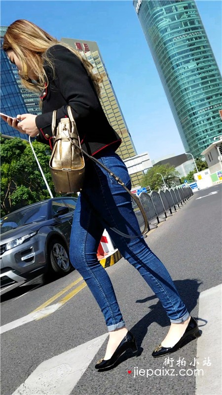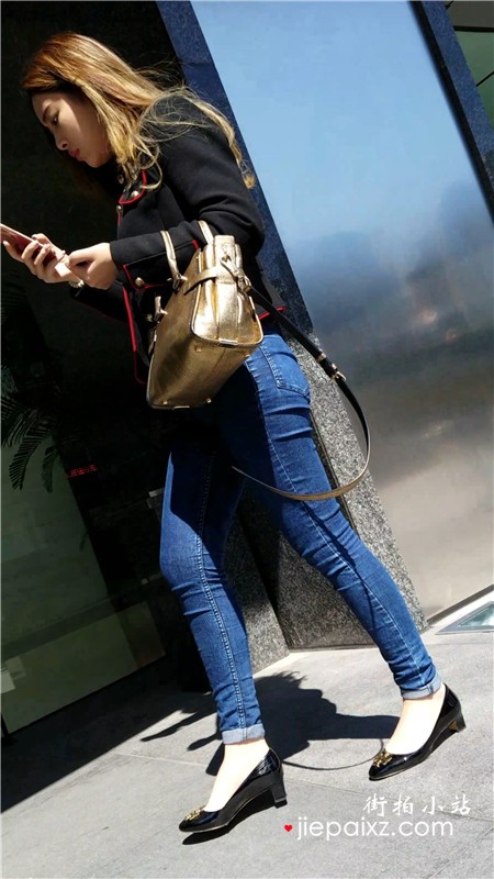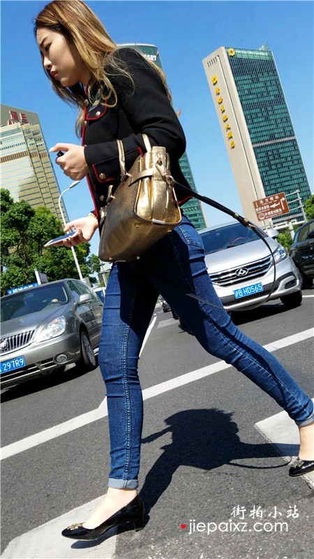 4K - 紧身蓝色牛仔裤黑色外套气质街拍美女