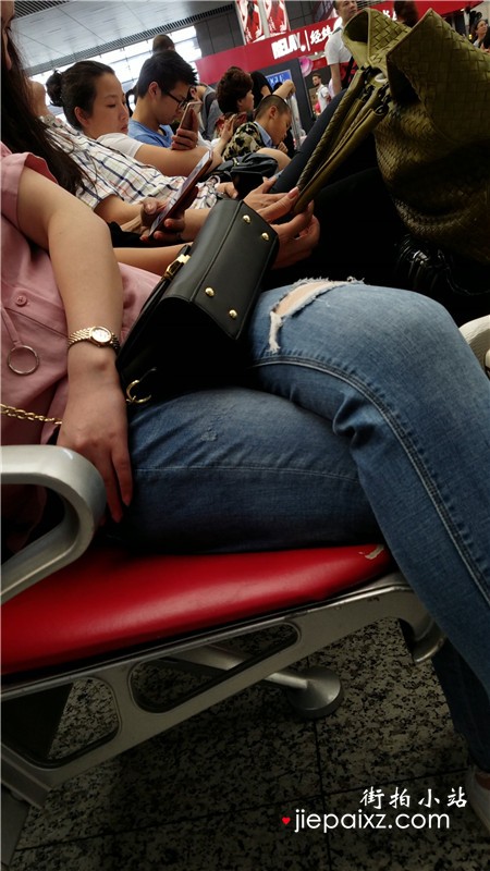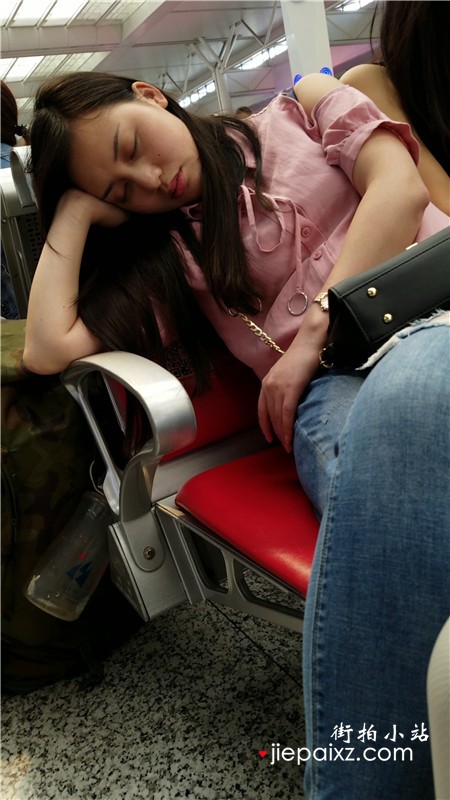 4k-候车室小睡一会的破洞紧身蓝牛粉色衬衫街拍美女
