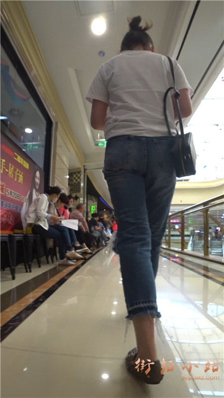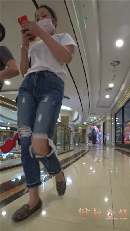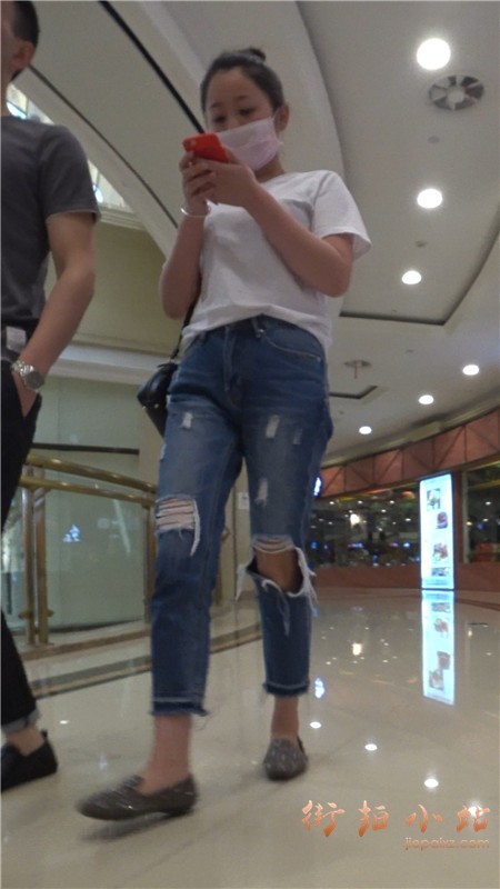 4k-粉色口罩破洞蓝牛小清新街拍美女
