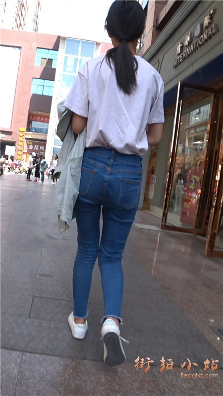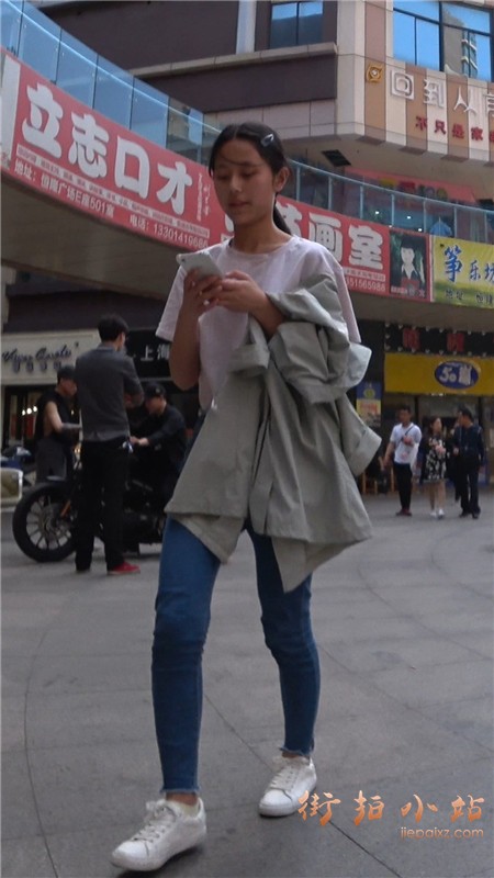 街拍白T恤蓝牛娇小身材小美女